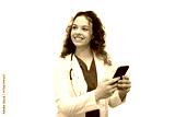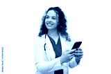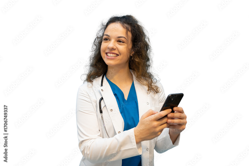 Female doctor smiling and using smartphone, isolated on transparent background, ideal for healthcare and technology concepts