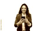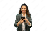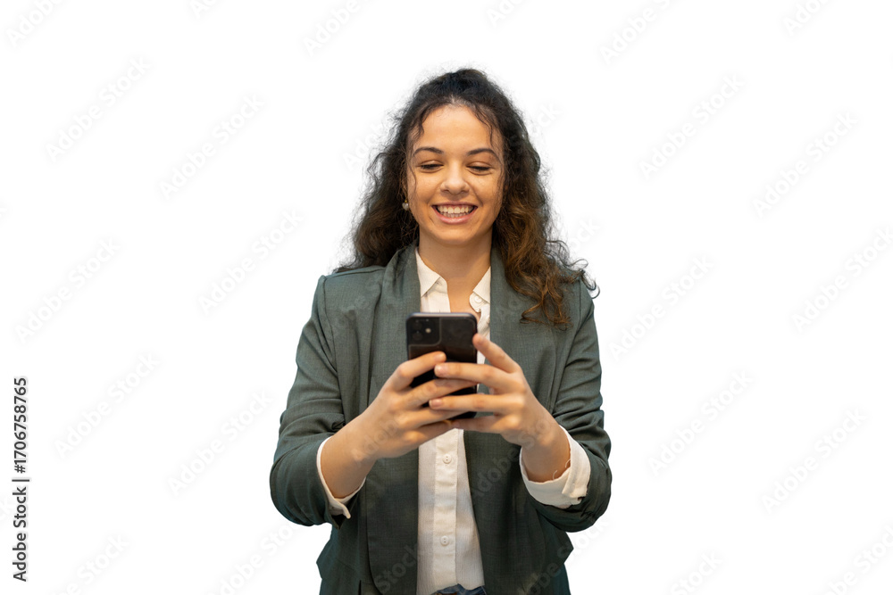 Professional woman smiling while texting on mobile phone, working remotely with wireless technology, transparent background for seamless graphic design