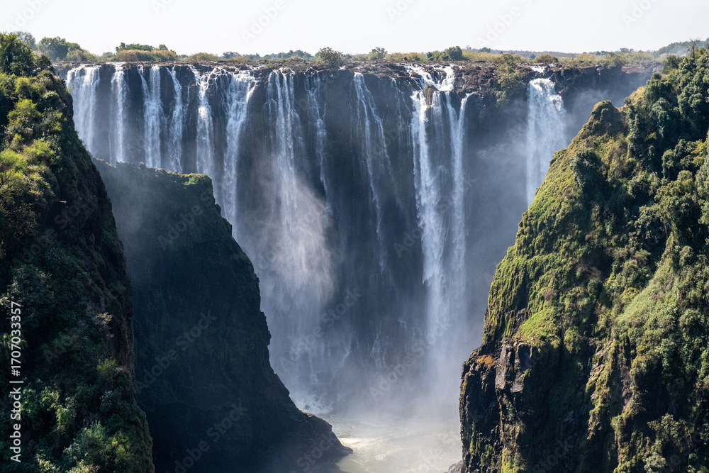 Victoria Falls, as seen from the Victoria Falls Bridge, connecting Zimbabwe and Zambia