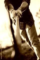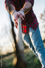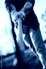 Man chopping wood with axe in rural field