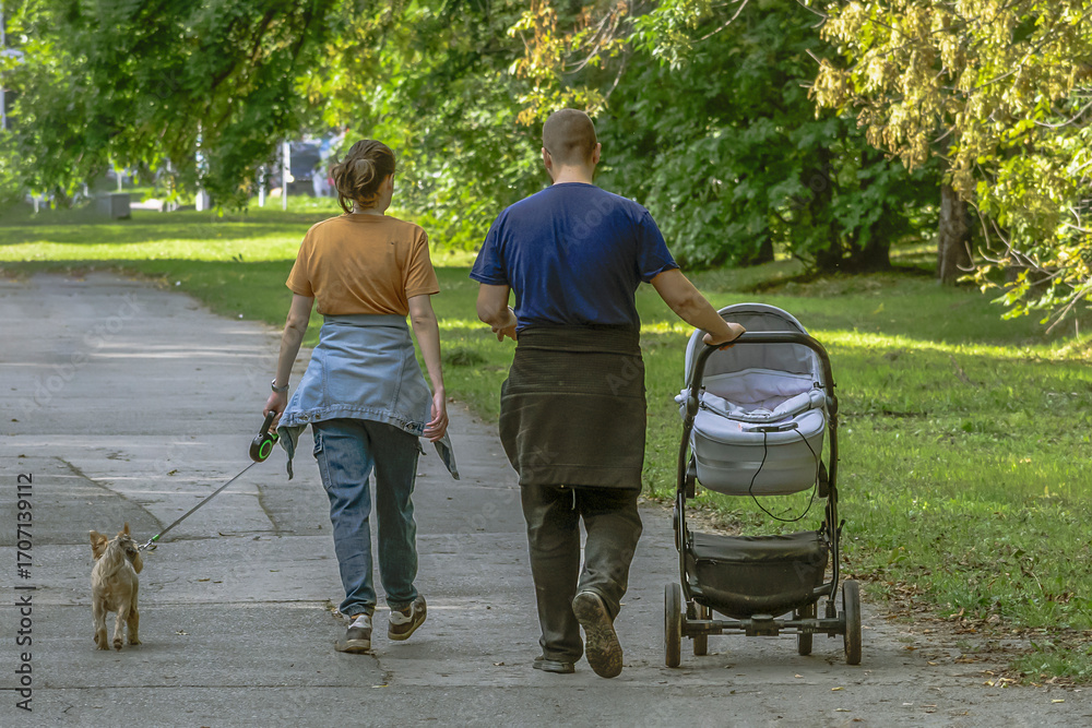 A man and a woman with a baby carriage and a dog walk along a park alley on an autumn day