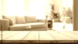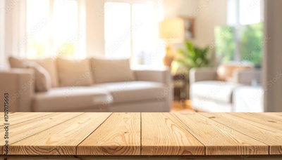 Bright Interior with Wooden Table Surface: Ideal for Product Mockups and Displays, Modern Living Room with Wooden Countertop: Perfect for Advertising Backgrounds