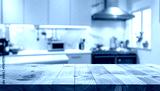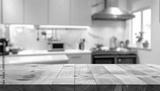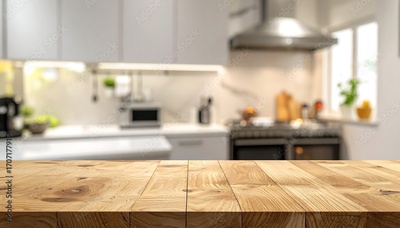 Cozy Kitchen Interior with Wooden Countertop, Blurred Background, A Rustic Wooden Countertop in a Bright, Modern Kitchen with Blurred Background