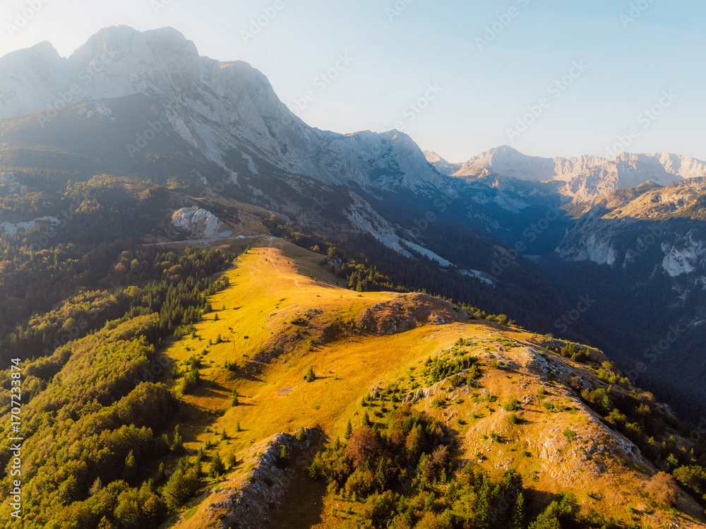 Sunset over Sutjeska National Park from Prijevor saddle, Bosnia and Herzegovina mountains with Bosanski Maglic the highest mountain in Bosnia and Herzegovina