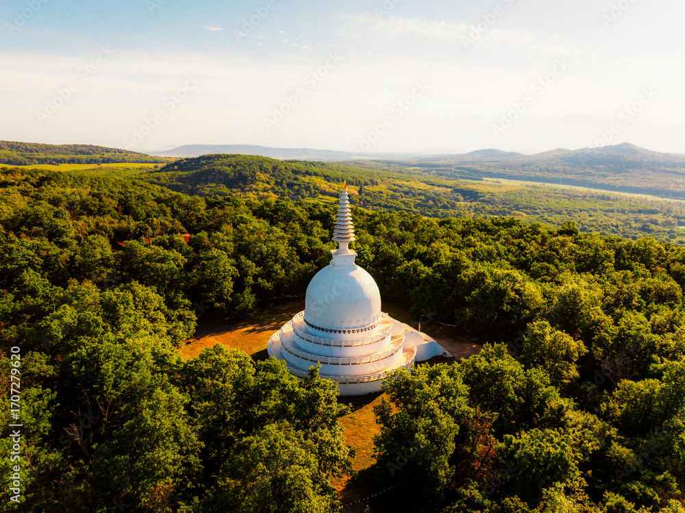 The snow-white Zalaszanto Peace Stupa, a Buddhist building and religious center near Lake Balaton in Hungary