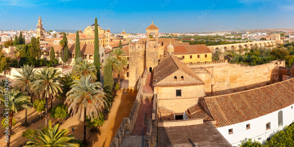 Panoramic view of Mezquita or Cathedral Mosque and Torre del Alminar, Roman bridge from Alcazar in the sunny day, Cordoba, Andalusia, Spain