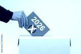 Wahl im Jahr 2026 - Hand wirft Stimmzettel in Wahlurne