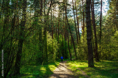 Man walking on a sunlit dirt path in a green forest. Summer forest scenery for nature background or outdoor activity concept.
