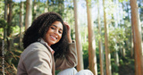 Happy woman, portrait and relax in woods for nature adventure, happiness and traveling holiday. Morning trip, hiking and relaxed person with smile in forest, explore or wellness for outdoor exercise