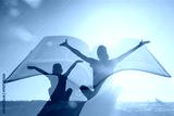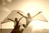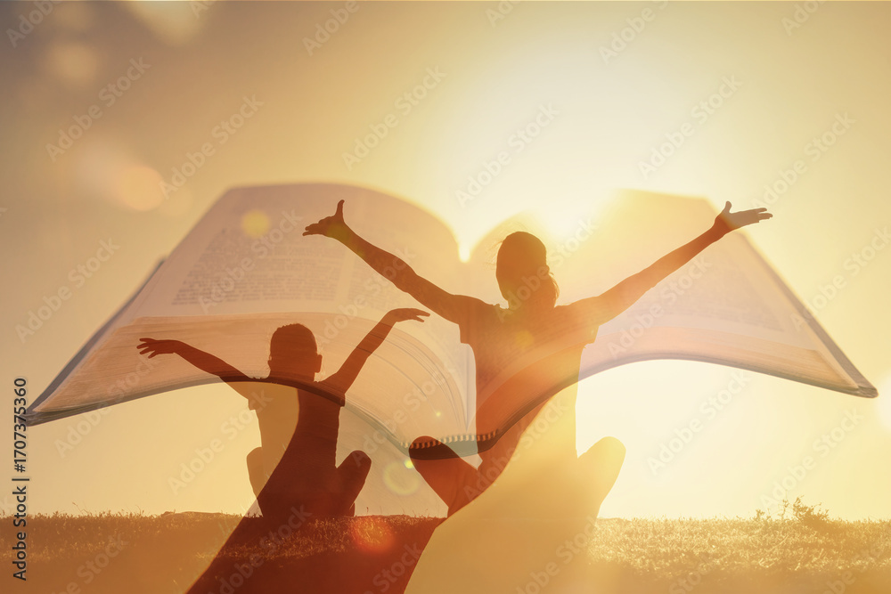 Parent child at sunset with an open book bible worshiping god, symbolizing family learning, and inspiration. Hope, religious belief education and togetherness themes.
