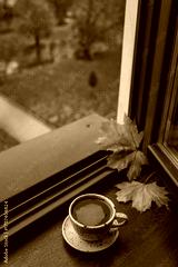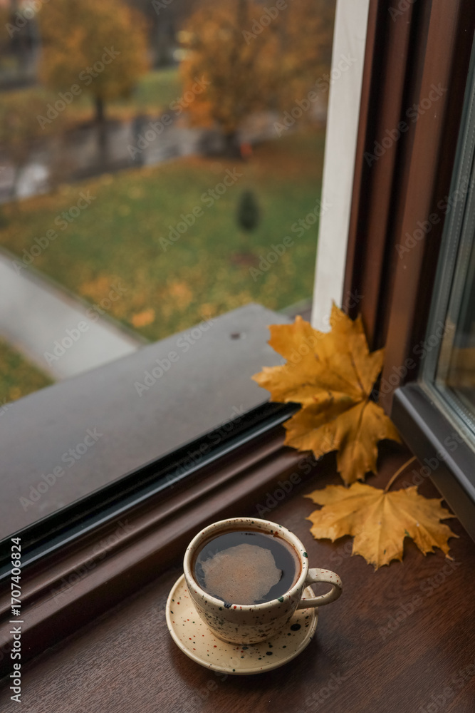 Coffee cup and autumn leaves on a windowsill with a scenic view