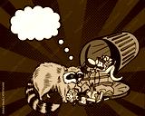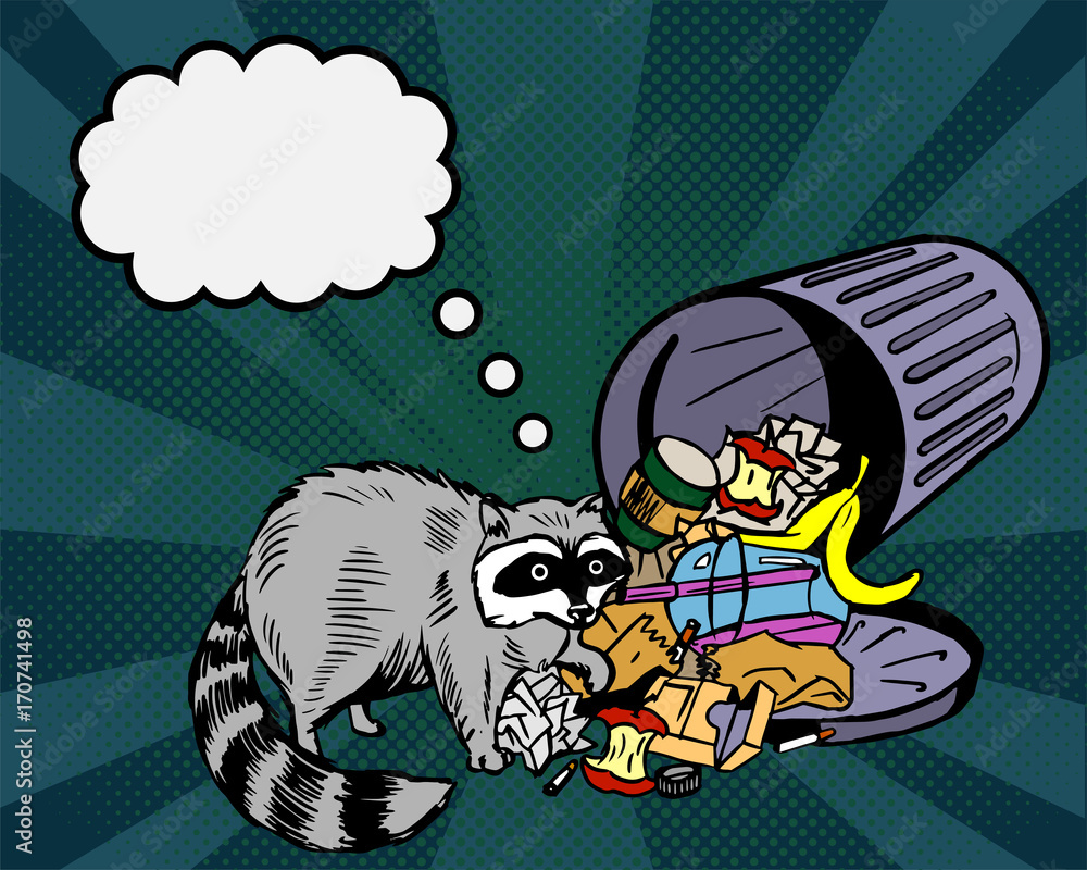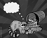 Raccoon eats from the trash and thinks about... A garbage can of street thief and homeless. Comic thinking bubble. Pop art illustration on an dark background.
