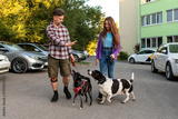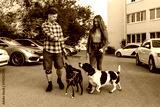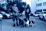 Man raises his hand to signal two dogs while his daughter holds their leashes, standing together in a residential parking area during evening training and walking