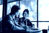 Two happy diverse multiethnic business team people working, talking in corporate office