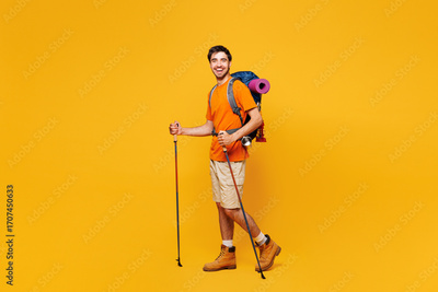 Full body young traveler man carrying backpack with stuff mat trekking poles isolated on plain yellow background. Tourist lead active lifestyle walk on spare time Hiking trek rest travel trip concept