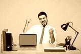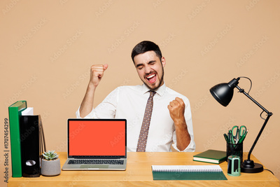 Young employee IT business man wear white shirt tie sit work at office desk use blank screen area laptop pc computer do winner gesture isolated on plain beige background. Achievement career concept.