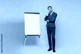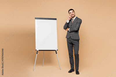 Full body young smiling successful employee business man corporate lawyer wears classic formal grey suit shirt tie work in office stand near blank whiteboard isolated on plain beige background studio.