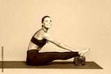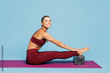 Full body young fitness trainer instructor sporty woman sportsman wears red sportswear train in home gym do leg stretch use yoga block isolated on plain blue background. Workout sport fit abs concept.
