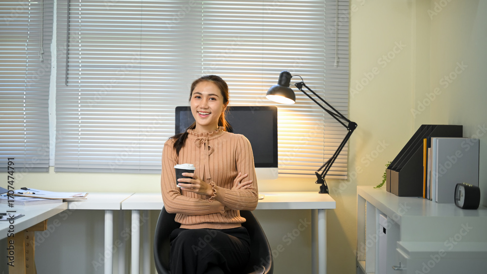 Smiling businesswoman enjoying coffee break while sitting in modern office