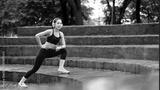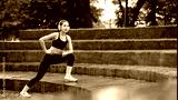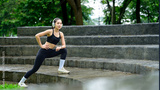 Fitness enthusiast doing leg stretches on stone steps during outdoor training session