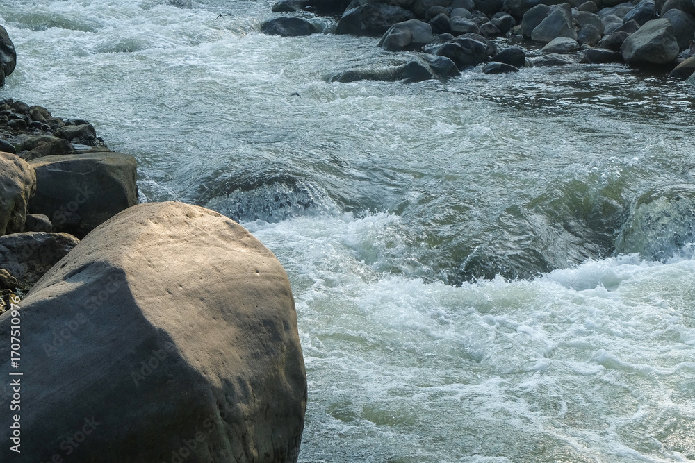 Large rocks on the edge of a mountain river. Can be used for advertising product placement design. For graphic design, 3D rendering and banner backgrounds