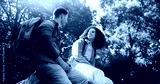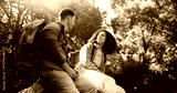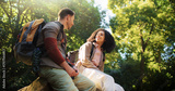 Hikers, talk and couple in nature, relax and break on adventure, forest and love on holiday or trip. Outdoor, people and bonding on journey, backpacking or happy on vacation, low angle and woods