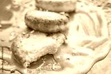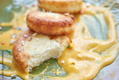 Close-up of freshly prepared syrniki pancakes with sweet condensed milk and crumbled sprinkles.