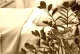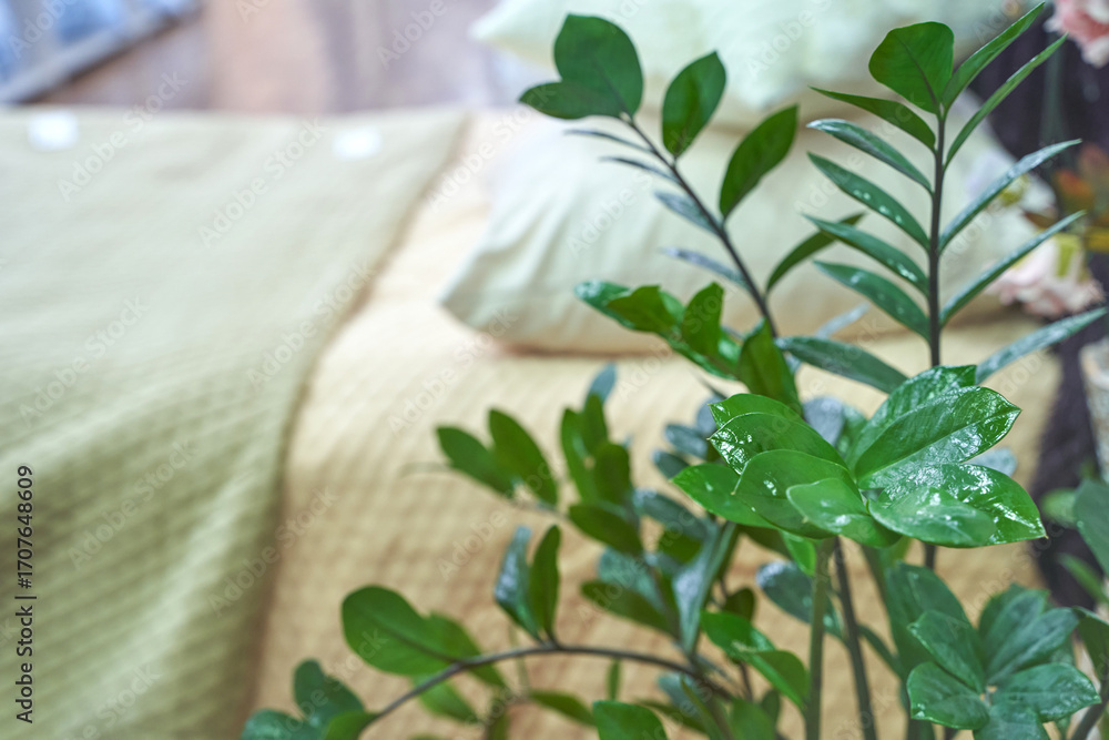 Close-up of vibrant green indoor plant with textured yellow bedspread in background.