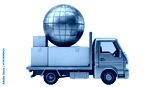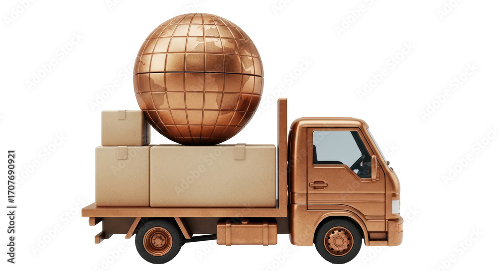 Isolated truck carrying boxes and global sphere symbolizing worldwide deliveries logistics