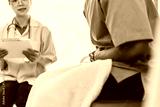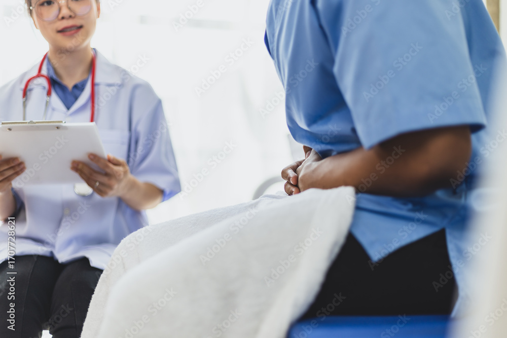 A female doctor talks to a young Asian woman about her stomach pain at the clinic table.