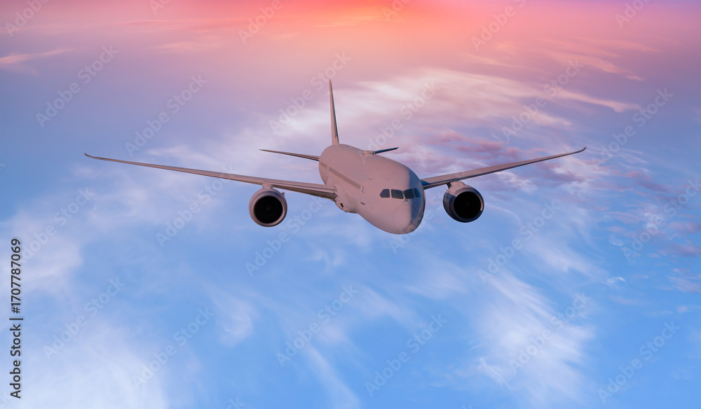 White passenger airplane flying in the sky amazing clouds in the background - Travel by air transport