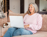 mature woman using wireless laptop apps browsing internet sit on sofa