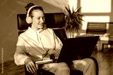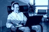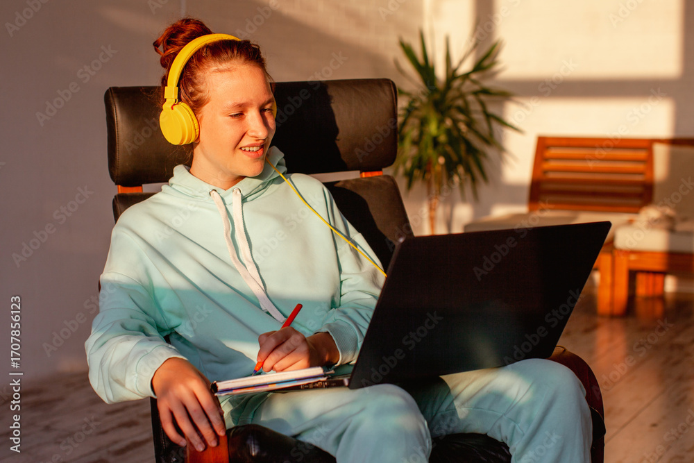 Female student looking at laptop screen at home