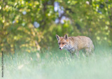 Young red fox is standing in the grass with green foreground and background. Horizontally.