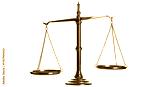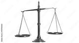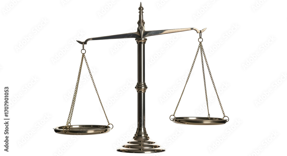 Isolated antique golden weighing scale tool in equilibrium for law, justice or balance