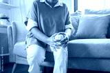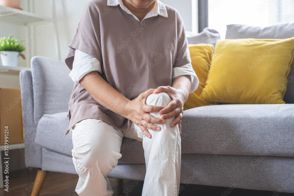 Body arthritis muscles stiff problem, aged woman suffering on leg, pain knee from disease chronic, hand massage rubbing joint injury, mature hurt or sore sitting on sofa at home. Health care people.