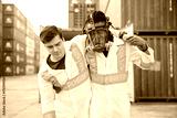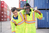 Two workers in safety attire, one assisting the other wearing a gas mask