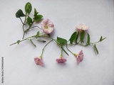 Field bindweed flowers. A branch of bindweed with delicate light pink flowers and green leaves is isolated in close-up. Floral composition