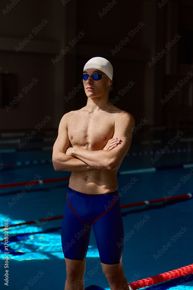 Swimmer standing with arms crossed showing confidence. Concept of motivation, sports advertising, confidence, leadership, fitness, and strong athletic identity.