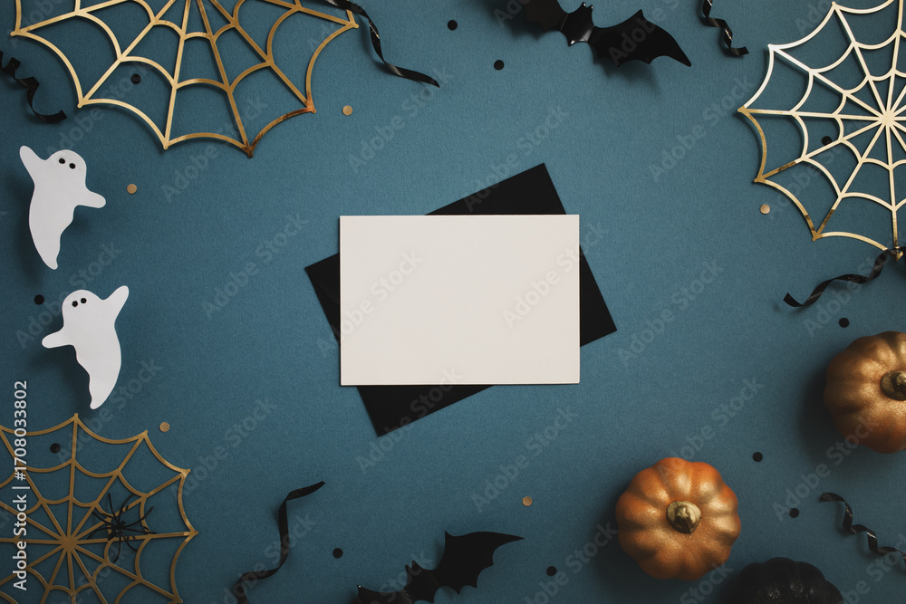 Halloween party composition with empty card and pumpkins, bats, spider web, ghosts on blue background top view.