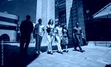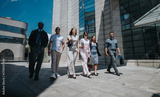 Business people walking confidently outdoors near modern architecture, embodying teamwork and professionalism. A diverse and collaborative team, showcasing unity and success in a professional setting.