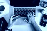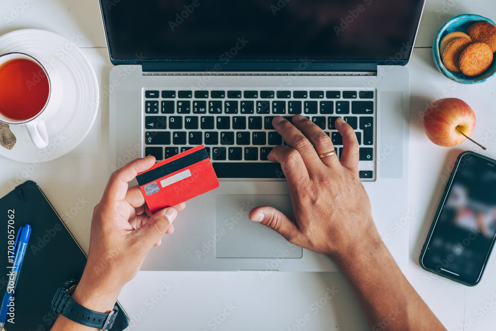 Man using laptop and holding credit card on desk with coffee cup and notebook. Concept of online shopping, ecommerce and digital payment.