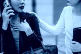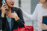 Businesswoman expresses distress during a phone call, being comforted by a colleague offering support.