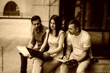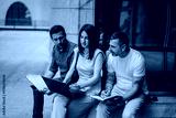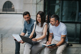 Group of professionals collaborating on a project outdoors, reviewing documents and using a laptop.