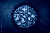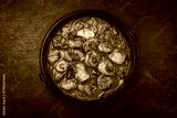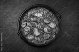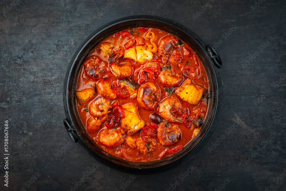 Traditional artisan homemade gambas prawn und fish stew romesco de peix served as top view in cast-iron skillet