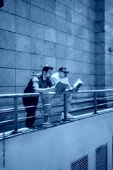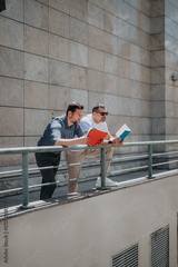 Two professionals discussing paperwork while leaning on a railing, engaged in a business setting outdoors.