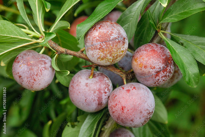Fresh Red Plums Ripening on Tree Branch with Green Leaves in Natural Orchard Setting
