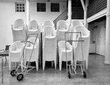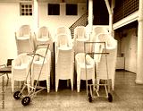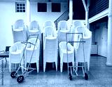 Stack of white plastic chairs and two hand trolleys ready to use for reception.