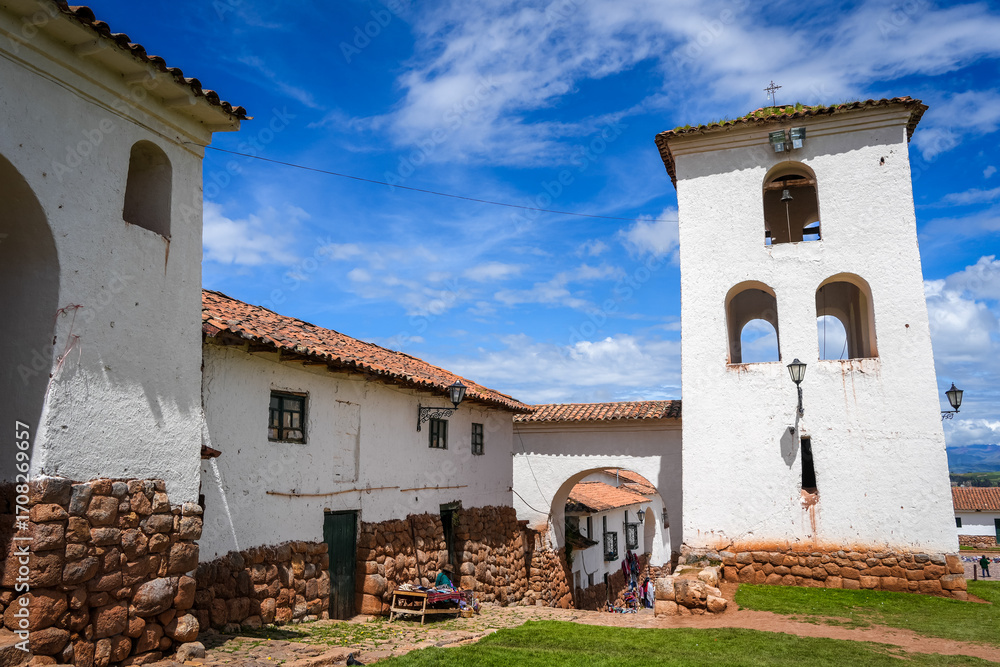 Colonial church in Chinchero, Peru, with white adobe bell tower