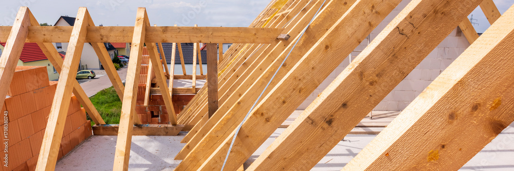 Auf dem Neubau von einem Wohnhaus wird mit Dachbalken ein neuer Dachstuhl montiert, als Symbolbild für Wohnbau und Wohnungspolitik